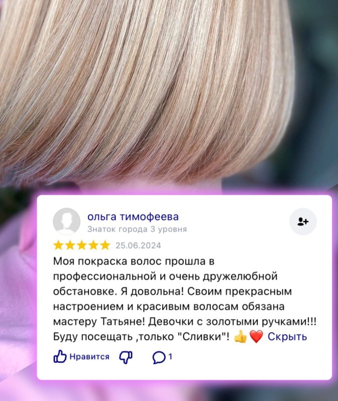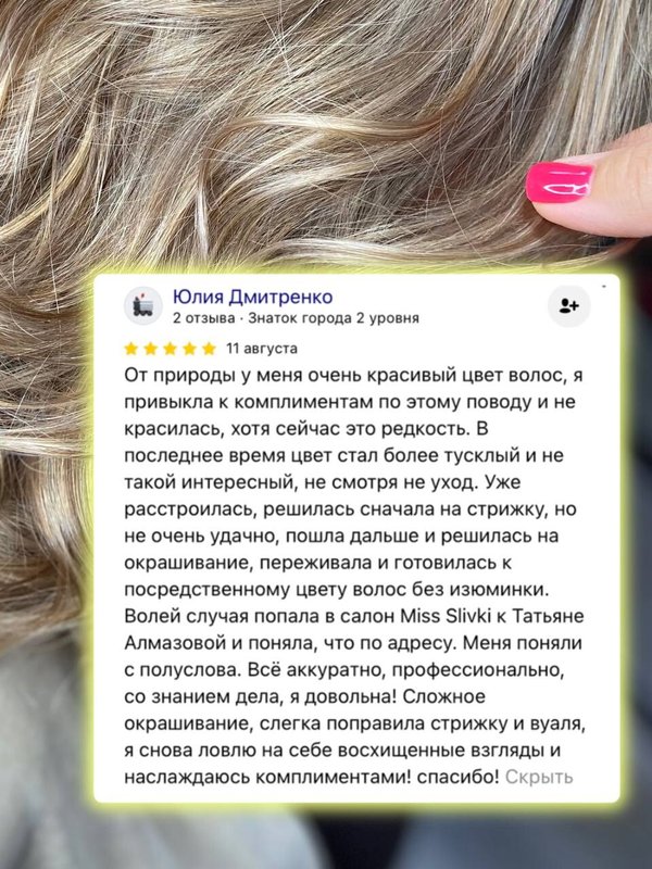 В салоне красоты MISS SLIVKI вам также предложат сделать окрашивание волос. Удачно подобранный цвет локонов преобразит привычную прическу, добавит жизни ярких красок, даст чувство преображения. Современные средства для окрашивания в руках квалифицированных мастеров не только не ухудшат состояние ваших волос, но, напротив, сделают их шелковистыми и гладкими, а при определенных условиях даже придадут дополнительный объем - эффект, которого едва ли можно достичь при домашней окраске.